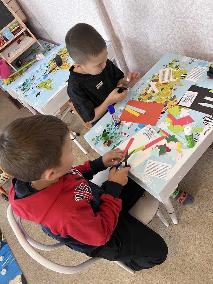В дружеской обстановке приступили к работе, ребята использовали цветную бумагу и картон, ножницы и клей. В технике оригами изготовили цветные карандаши, вырезали листья.