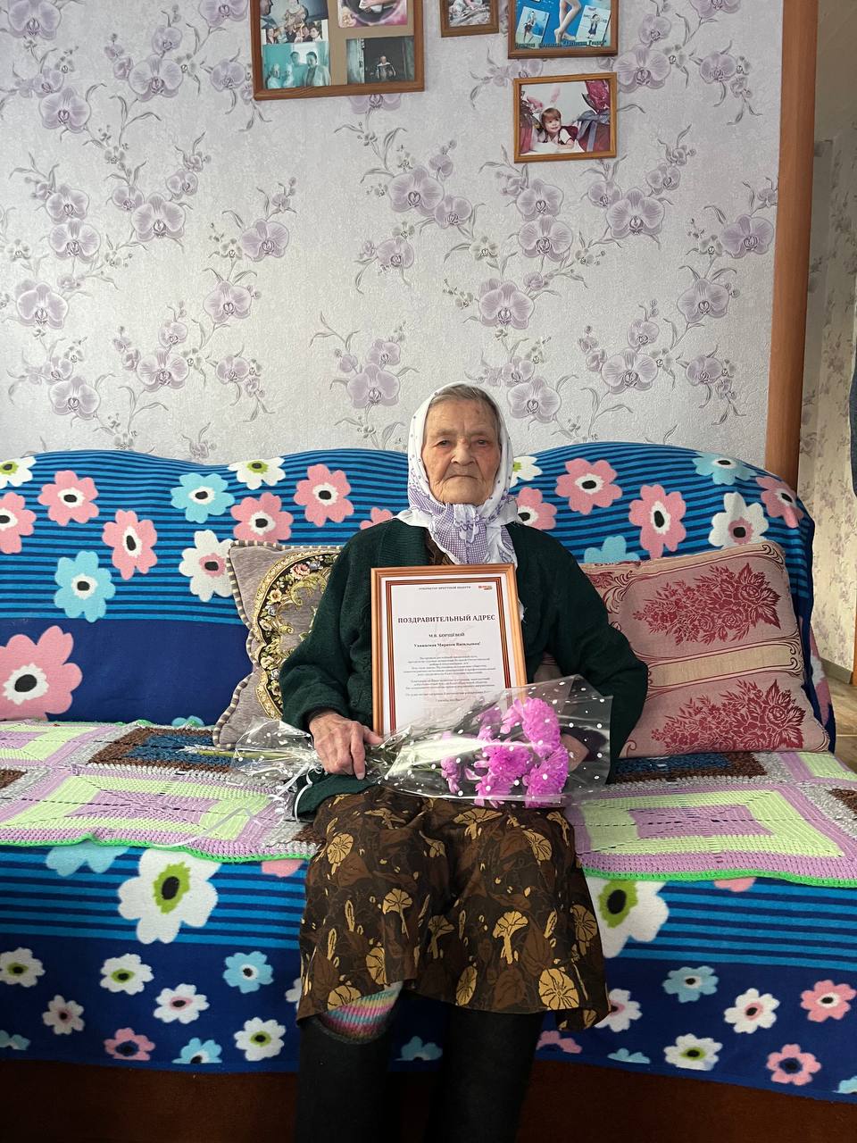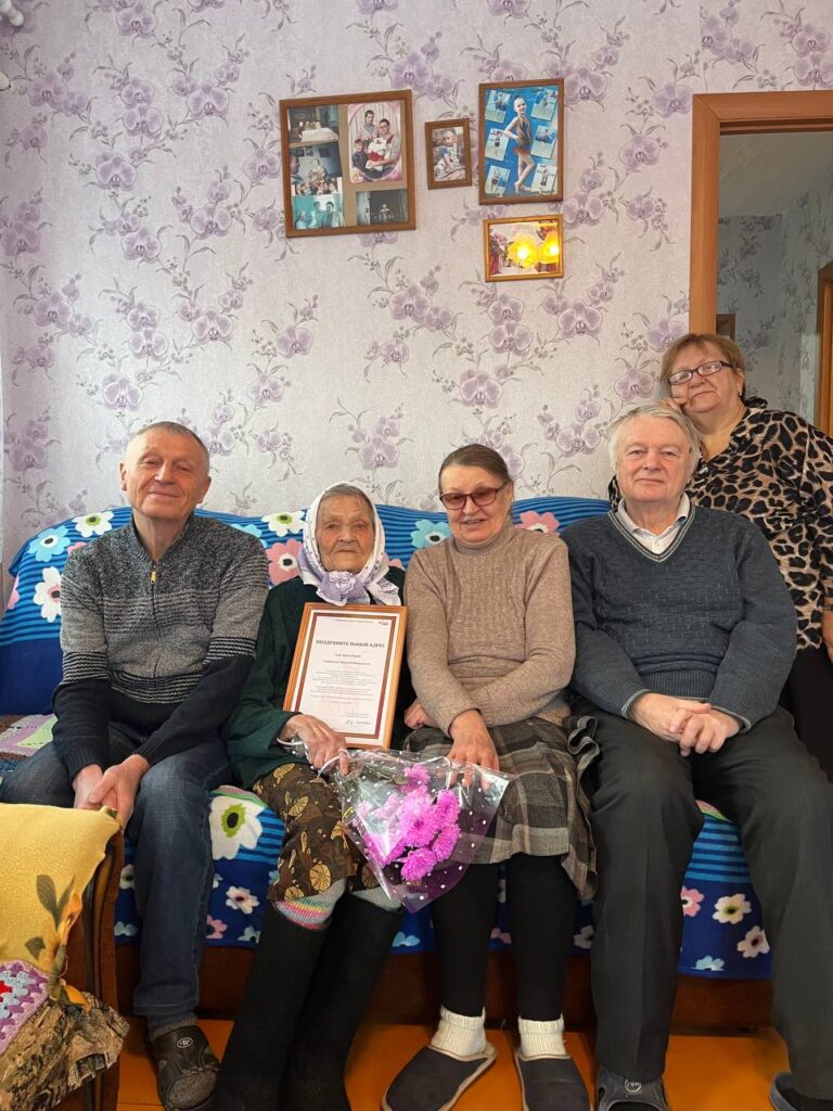 Поздравить юбиляра приехала специалист отдела организационной работы ОГБУ «УСЗСОН по Нукутскому муниципальному округу» Махусаева Н.А., вручила поздравительный адрес от Губернатора Иркутской области, подарки.
